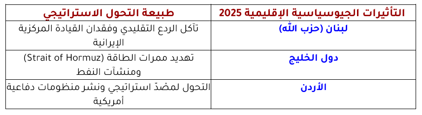 إنَّ الهزات الارتدادية لعملية “الأسد الصاعد” لم تتوقف عند الحدود الإيرانية، بل امتدت لتضرب العمق الجيوسياسي للدول المجاورة، معيدةً تشكيل موازين القوى بشكلٍ جذريّ. لقد أدت الضربات المركزة إلى تآكل “طوق النار” (Ring of Fire) الذي حاولت إيران بناءه حول إسرائيل عبر وكلائها في المنطقة.(7)