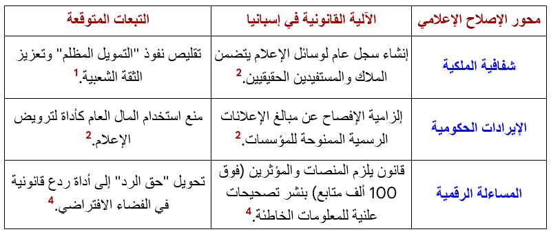 تتمحور الإصلاحات الإسبانية حول فكرة “الشفافية المطلقة” في ملكية وسائل الإعلام. الهدف هو كشف المستفيدين الحقيقيين من الإمبراطوريات الإعلامية لمنع التمويل الخفي الذي قد يوجه الرأي العام لخدمة أجندات سياسية أو اقتصادية معينة.(1)