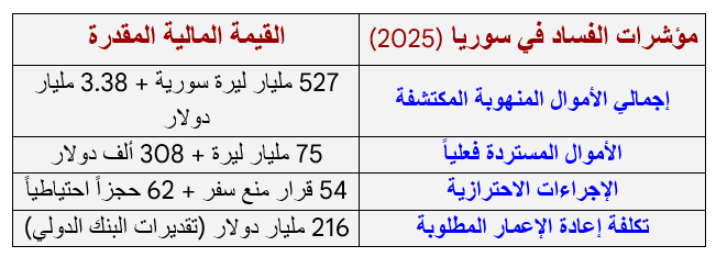 في سوريا، بدأت الهيئة المركزية للرقابة المالية في 2025 تحقيقات واسعة في 246 قضية فساد تعود لعهد النظام الساقط.(18)