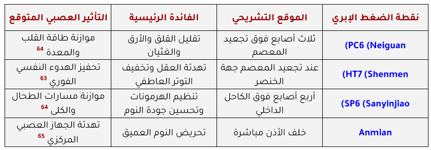 • الضغط الإبري (Acupressure): أثبتت الدراسات أن الضغط على نقاط محددة لمدة دقيقتين قبل النوم يحسن جودة النوم بنسبة كبيرة. تشمل هذه النقاط “ني غوان” (PC6) الواقعة في المعصم بين الوترين، و”شين مين” (HT7) الملقبة بـ “بوابة الروح“، و”سان يين جياو” (SP6) فوق الكاحل.(63) تعمل هذه التقنية على تحفيز إطلاق الوسطاء العصبيين المهدئين وتفعيل الجهاز العصبي الباراسمبثاوي.(66)